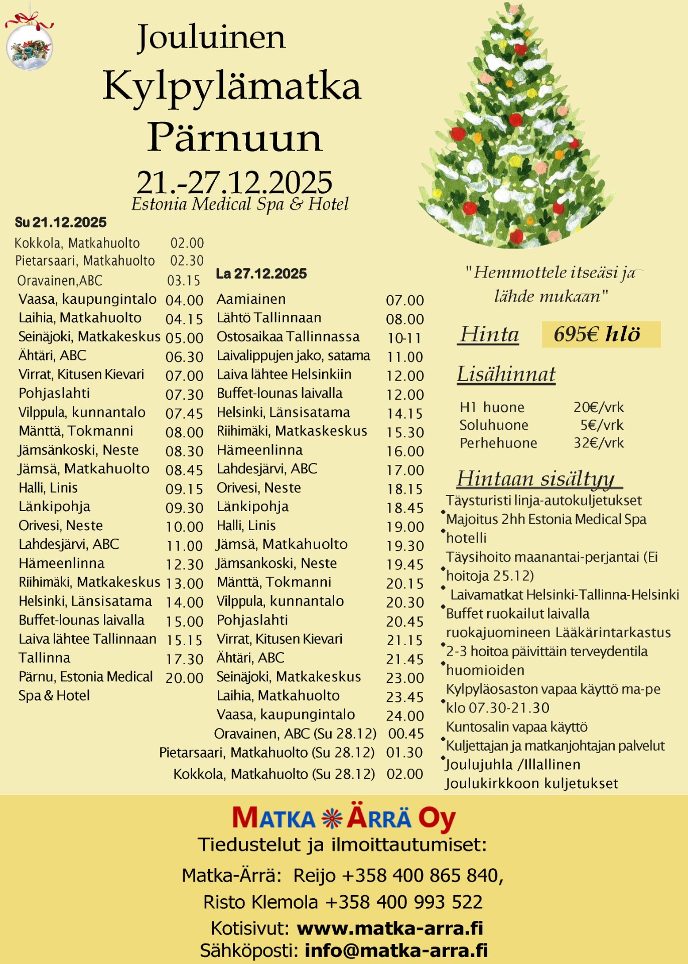Kylpylämatkaan sisältyy 2-3 hoitoa päivittäin (ma-pe) terveydentila huomioiden. Päivittäiset hoidot on valittavissa seuraavista vaihtoehdoista: